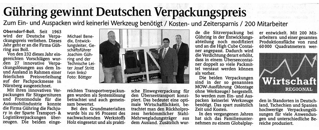 En la Feria "Fachpack" en Nuremberg (25.09. hasta el 27.09.2012) se nos fue otorgado el codiciado trofeo del Premio Alemán del Embalaje. Bajo el patrocinio del Ministerio Federal de Economía y Tecnología, pudimos imponernos ante 232 soluciones/propuestas de embalaje innovadoras en el área de dar soluciones de transporte y logística